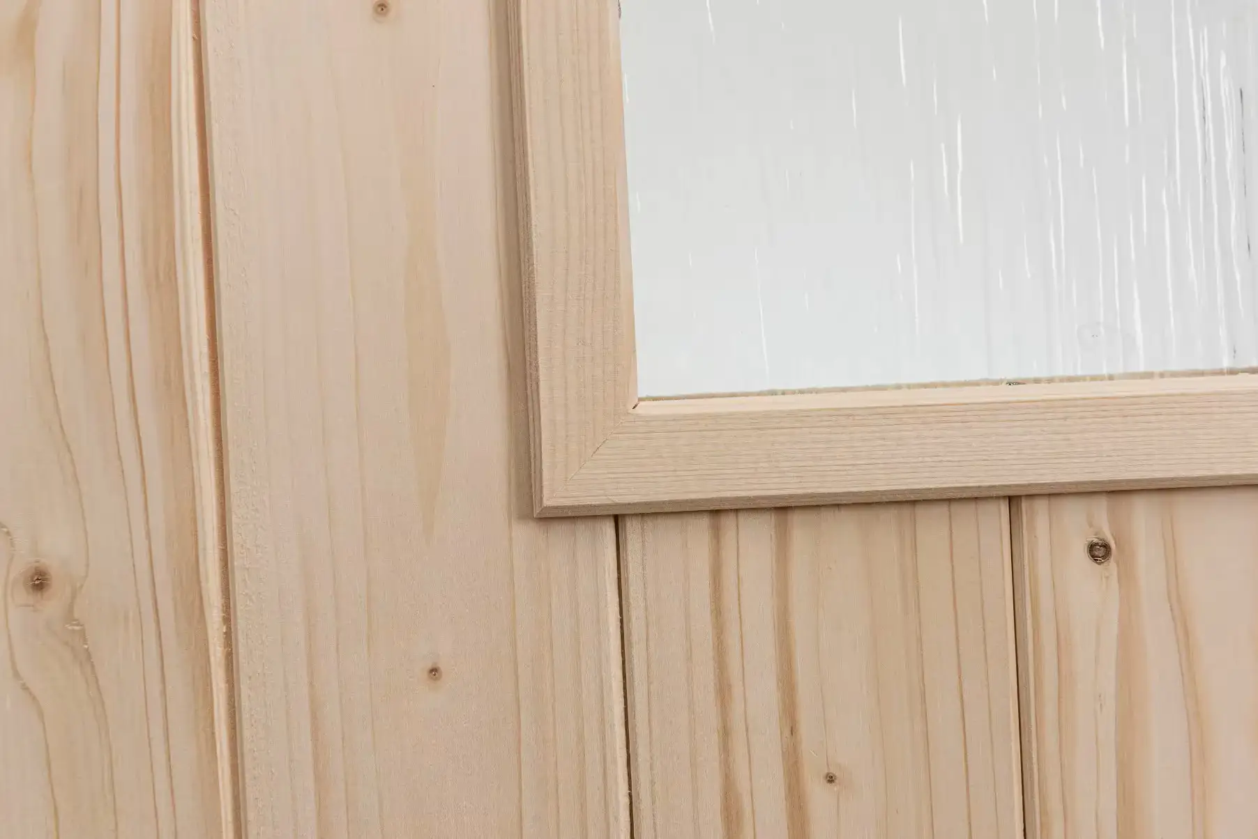 Palubkové dveře Quatro mix se čtyřmi izolačními dvojskly 20 x 20 cm vzoru Kůra jsou variací řady Quatro. Jedná se o dveře typické šíře 60, 70, 80 a 90, výše 198,5 cm a tloušťky 45 mm. Jsou zatepleny 2 cm polystyrenem a osazeny z obou stran palubkami 92 x 12 mm. Rozměry polodrážky činí 25 x 15 mm. Standardně jsou připraveny pro zámek FAB 60/90 mm a k osazení do dřevěných i ocelových zárubní. Dveře jsou bez povrchové úpravy.